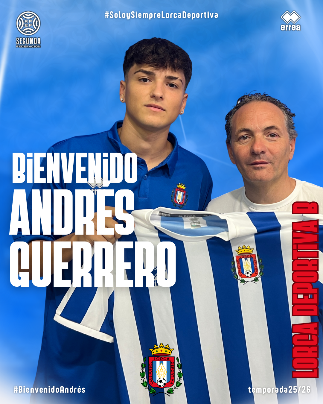 Andrés Guerrero Fernández (Almería, 2006) es desde hoy nuevo jugador del Lorca Deportiva B. El extermo almeriense, con raices lorquinas, que también puede jugar de delantero proviene del Poli Ejido con el que ha llegado a debutar en Tercera Federación. Andrés se formó en la cantera del Ciudad de Roquetas.
