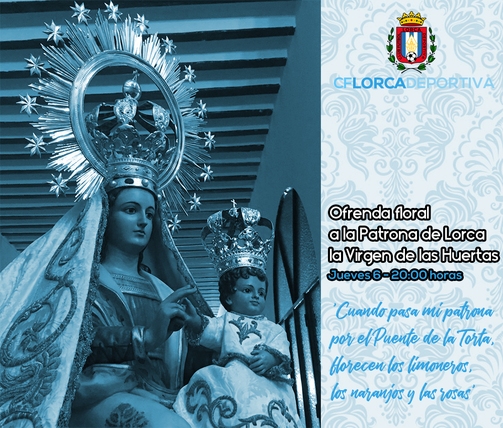 Todo el club, jugadores, cuerpo técnico y directivos, acudirán el próximo jueves 6 de septiembre al Convento patronal a realizar la tradicional ofrenda floral a la Virgen de las Huertas, patrona de la ciudad de Lorca. Como el Lorca Deportiva hace desde su fundación en 2012, rendirán sus respetos a la Virgen y le pedirán su mediación para conseguir los objetivos deportivos de la entidad esta temporada. El acto que tendrá lugar tras la misa de las 8 de la tarde, se enmarca dentro del programa de actividades religiosas de la festividad de la Patrona de la ciudad que organiza la Hermandad de la Virgen de las Huertas.