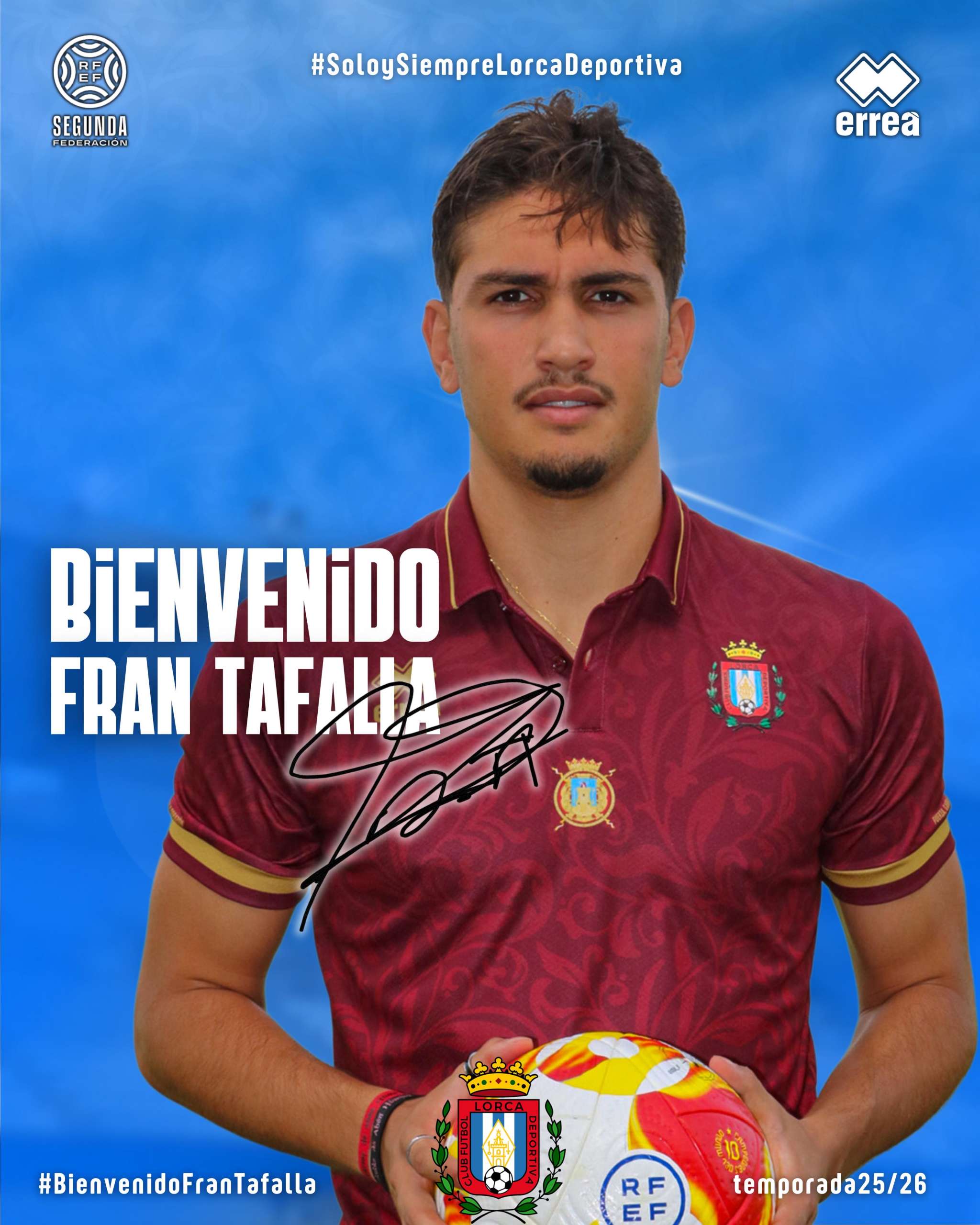 Fran Tafalla es la décimonovena confirmación del Lorca Deportiva 25/26 tras los anuncios de continuidad de Carrasco, Peque, Sergi Monteverde, Galiano, Gabri López, Bertomeu, Dani Albiar y Kiko y los fichajes del delantero lorquino Tomás Inglés, el centrocampista murciano, Álvaro Martínez, el lateral izquierdo Morros, el portero Ernestas, el extremo izquierdo Juanma, el delantero centro Naranjo, el centrocampista Spinman, el lateral derecho Jaime Escobar, el extremo izquierdo lorquino, Juan Hernández y el central Saturday.
