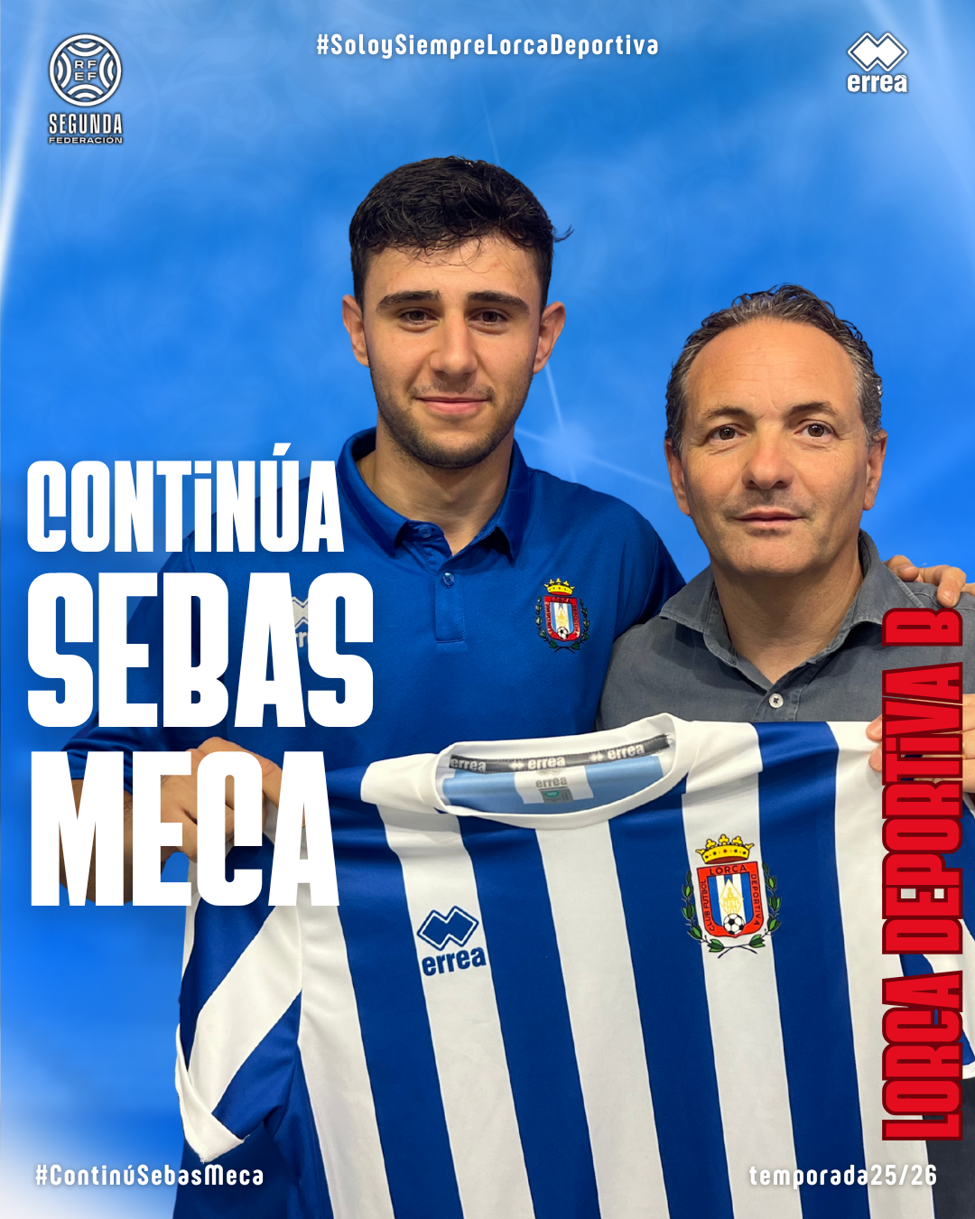 Sebastian Meca Cuadrado, Sebas Meca (Lorca, 2003) continuará una temporada más en el Lorca Deportiva. Sebas cumplirá su segundo año el equipo de Preferente Autonómica que dirige Juan Carlos Cuadrado. El centrocampista lorquino llegó la campaña pasada procedente del filial del Yeclano Deportivo que jugó playoff de ascenso a Tercera Federación. Antes perteneció a la disciplina del Cartagena FC con el que compaginó el equipo juvenil de División de Honor con el senior de Tercera Federación.